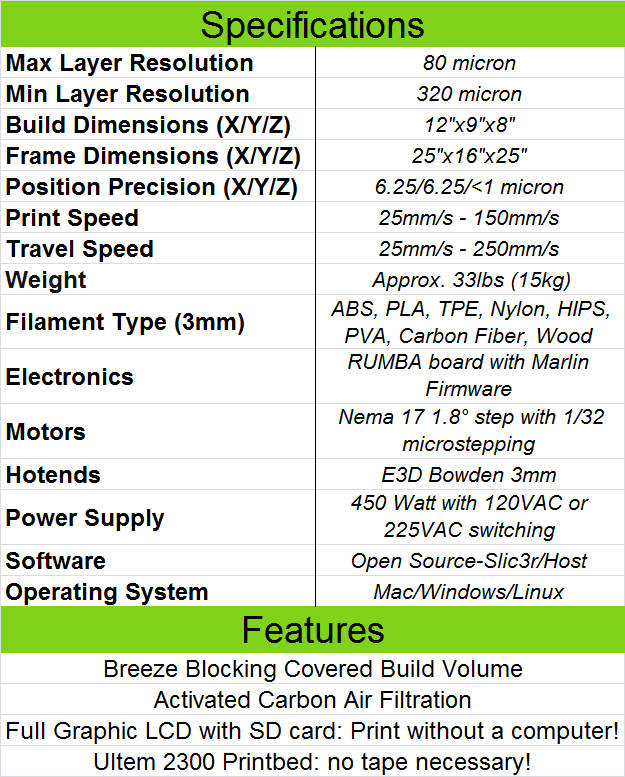 Additional features and capabilities include an LCD display, SD memory card, support for PLA and ABS filament, independent operation (no need to be attached to a PC), igus linear slides with pretension, Reprappro Hot End and quick changeover print head assembly.